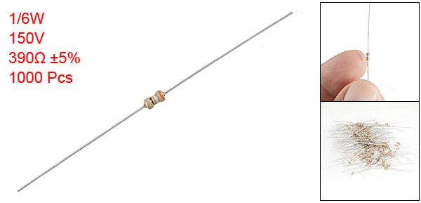Product Name Carbon Film Resistor Quantity 1000±2% Pcs Withstand Voltage 150V Rated Power 1/6W Resistance Value 390 Ohm Tolerance ±5% Lead Diameter(Approx.) 0.4mm/ 0.016" Body Size 4 x 2mm/ 0.16" x 0.08" (L*D)