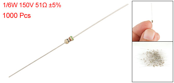 Product Name Carbon Film Resistors Rating Power 1/6W Resistance 51 Ohm Resistance Tolerance ± 5% Withstand Voltage 150V Size(Not Include Leads) 0.33 x 0.17cm / 0.130" x 0.067"(L*D) Leads Dia(Approx) 0.03cm / 0.012" Overall Length(Approx) 4.55cm / 1.8" Color See the Picture Weight 58g Package Content 1000(±2%) Pcs of Carbon Film Resistors - Reviews