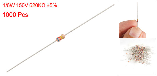 Product Name Carbon Film Resistors Rating Power 1/6W Resistance 620K Ohm Resistance Tolerance ± 5% Withstand Voltage 150V Size(Not Include Leads) 0.32 x 0.17cm / 0.126" x 0.067"(L*D) Leads Dia(Approx) 0.03cm / 0.012" Overall Length(Approx) 4.6cm / 1.8" Color See the Picture Weight 57g Package Content 1000(±2%) Pcs of Carbon Film Resistors - Reviews