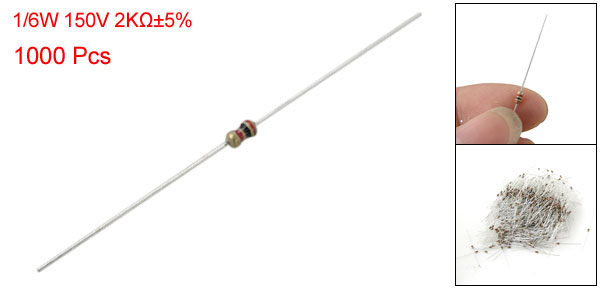 Product Name Carbon Film Resistors Quantity 1000±2%Pcs Rating Power 1/6W Resistance 2K Ohm Resistance Tolerance ± 5% Withstang Voltage 150V Size(Not Include Leads) 1.7 x 3mm/ 0.066" x 0.118"(D*L) Leads Dia(Approx) 0.3mm/ 0.012" Overall Length(Approx) 47mm/ 1.8" Color As Picture Show Weight 57g Package Content 1000 x Carbon Film Resistors - Reviews