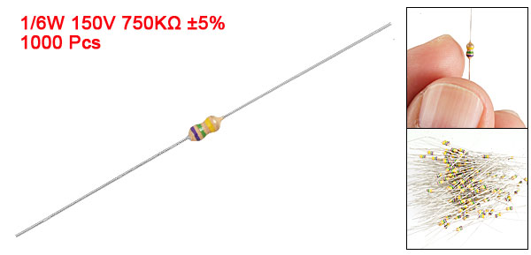 Product Name Carbon Film Resistors Rating Power 1/6W Resistance 750K Ohm Resistance Tolerance ± 5% Withstand Voltage 150V Size(Not Include Leads) 0.36 x 0.17cm / 0.142" x 0.067"(L*D) Leads Dia(Approx) 0.03cm / 0.012" Overall Length(Approx) 4.55cm / 1.8" Color See the Picture Weight 58g Package Content 1000(±2%) Pcs of Carbon Film Resistors - Reviews