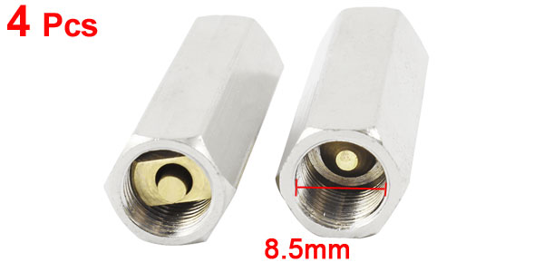 Details1/8 PT Female Thread Air Gas Water Non-return One Way Check Valve 4 Pcs  Product Name One Way Air Check Valve Color Silver Tone Thread Size 1/8 PT Thread Diameter 8.5mm Size 37 x 12mm/ 1.45" x 0.43" (L*D) Material Metal Weight 84g Package 4 x One Way Air Check Valve