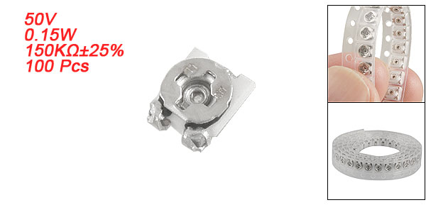 Product Name Potentiometer Quantity 100±2% Pcs Withstand Voltage 50V Rated Power 0.15W Resistance Value 150KΩ (150, 000ohm) Tolerance ±25% Mounting Type SMT Turn Number Single Resistance Change Type Linear Resistive Material Carbon Fim Temperature Coefficient ±250ppm/°C Square Body Size 3 x 3mm/ 1/8" x 1/8" (L*W)