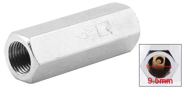 Product Name One Way Air Check Valve Color Silver Tone Thread Size 1/8" PT Thread Diameter 9.5mm Size 38 x 15mm/ 1.5" x 0.6" (L*D) Material Metal Weight 29g Package 1 x One Way Air Check Valve - Reviews
