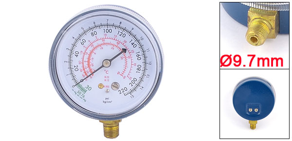 Product Name Compound Gauge Pressure Intensity Display Range 0-220 Psi; 0-15 kg/cm²; 0-40 °C Male Connector Diameter 9.7mm/1/8" PT Size 7.2 x 2.8 cm/ 2.8" x 1.1" (D*T) Color Clear, Blue Exterior Material Metal. Plastic Net Weight 110g Package 1 x Compound Gauge - Reviews