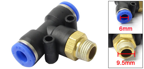 Product Name Pneumatic Quick Fittings Type T Connector One Touch Connector 6mm Male Thread Connector 9.5mm Thread Size 1/8" PT Material Plastic, Metal Dimension (Approx) 3.8 x 3 x 1.2cm/ 1.49" x 1.18" x 0.47" (L*W*T) Color Black, Blue Weight 11g Package Content 1 x Pneumatic Quick Fittings - Reviews
