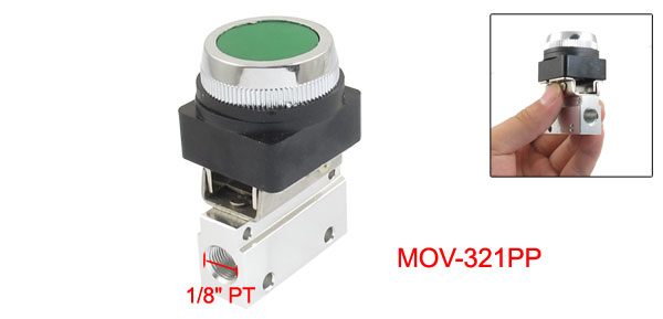 Details1/8" PT Thread Three Way Two Position Momentary Pneumatic Valve MOV-321PP  Product Name Pneumatic Valve Model MOV-321PP Operation Type Momentary Head Shape Flat Working Medium Clear Air (40µm filteration) Port Type 3 Position Type 2 Pipe Thread Diameter 1/8" PT Operating Temperature Range 0 ~ 60°C Working Pressure Range 0 ~ 0.8MPa Total Size(Approx) 4.4 x 3.3 x 6.4cm / 1.7"x 1.3"x 2.5" (L*W*H) Material Alloy Main Color Silver Tone, Black, Green Net Weight 76g Package Content 1 x Pneumatic Valve