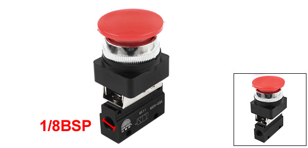 Product Name Mechanical Valve Model MOV-03A Actuator Type Momentary Red Mushroom Button Working Medium Air Control Type Manual Control Position and Way No. 2 Position 3 Way Pipe Thread Diameter Air Inlet=Air Outlet=Exhaust=9mm Pipe Thread Size 1/8BSP Fixing Hole Diameter 4mm/0.16" Working Pressure Range 0-1kgf/cm2 Push Button Diameter 3.8cm / 1.5" Total Size(Approx.) 76 x 38mm / 3" x 1.5"(H*D) Material Metal, Plastic Net Weight 82g Package 1 x Mechanical Valve - Reviews