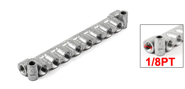 Product Name Manifold Block Ports Quantity 10 Position Quantity 8 Color Silver Tone Material Metal Female Thread Size 1/8PT Female Thread Dia. 9.5mm/ 0.37" Overall Size 145 x 24 x 19mm / 5.7" x 0.94" x 0.75" (L*W*H) Weight 140g Package 1 x Manifold Block - Reviews