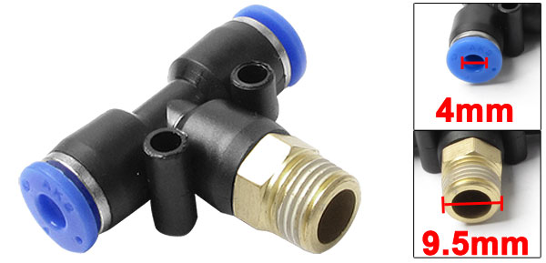 Product Name Pneumatic Quick Fittings Type T Connector One Touch Connector 4mm Male Thread Connector 9.5mm Thread Size 1/8" PT Material Plastic, Metal Dimension (Approx) 3.6 x 2.9 x 1.1cm/ 1.41" x 1.14" x 0.43" (L*W*T) Color Black, Blue Weight 9g Package Content 1 x Pneumatic Quick Fittings - Reviews