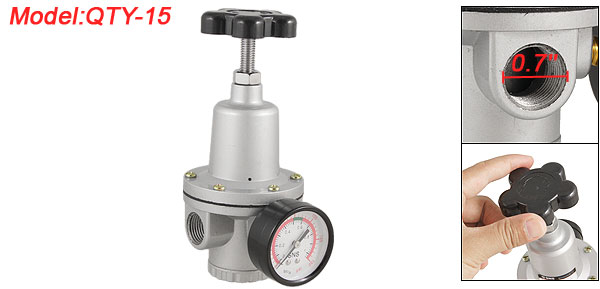 Product Name Pneumatic Regulator Model QTY-15 Material Metal, Plastic Pressure 1.5-8kgf/cm2 Port Size 1/2" Pressure Gauge Range 0-1 MPa, 0-150 Psi Inner Thread Diameter 1.8cm/0.7'' Total Size 10.5 x 7.6 x 17.5cm/4.1'' x 3'' x 6.9'' (L*W*H) Pressure Gauge Size 5.1 x 2.2cm/2'' x 0.9'' (D*T) Color Black, Silver Tone Weight 651g Package Content 1 x Pneumatic Regulator - Reviews
