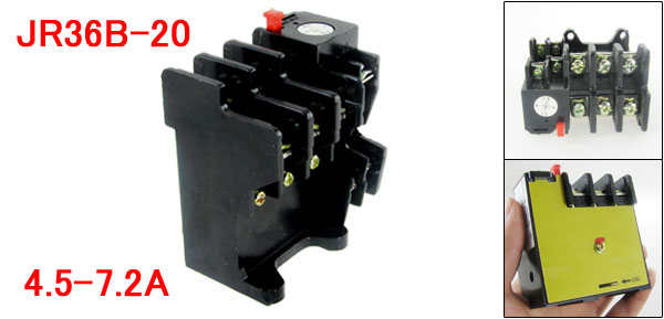 Product Name Thermal Overload Relay Model JR36B-20 Thermal Relay Rated Current 20A Adjusting Current Range 4.5-7.2A Thermal Element Rated Current 7.2A Auxiliary Ui:AC 380V Ith: 10A AC-15: 180VA Contact Type: 1 NO + 1 NC Primary Ui: AC 660V Tripping Class: 10A Fit Cable <=28mm² Fixing Holes Size 4.4 x 5.8mm / 0.17" x 0.23"(L*W) Fixing Holes Spacing 38mm / 1.5" Overall Size (Approx.) 70 x 75 x 47mm / 2.7" x 3" x 1.8" (L * W * T) Color As Picture Shown Weight 173g Package Content 1 x Thermal Overload Relay  - Reviews