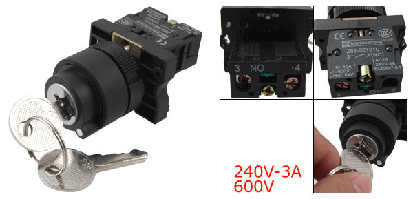 Product Name Keylock Rotary Switch Model XB2-EG21 Contact Type Single NO(Normal Open) Key Button Position 2 Position Working AC Frequency 50Hz-60Hz Ith 10A AC15 240V-3A Ui 600V Uimp 6kV IEC 947-5-1 Mount Hole Diameter 22mm / 0.87"(7/8") Fit Panel Thickness Max 5mm / 2" Top Diameter ~21mm / 0.8" Overall Size ~40 x 30 x 63mm/ 1.6" x 1.2" x 2.5" (L*W*H) Material Plastic, Electronic Parts Main Color Black Weight 59.5g Package Content 1 x Keylock Rotary Switch 2 x Keys - Reviews