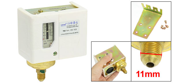 Product Name Pressure Switch Model NO. SSNS-103 Adjustable Range 10-40 PSI Differential 7-30 PSI Thread Diameter 11mm Overall Size 8 x 4.6 x 10cm/ 3.1" x 1.8" x 3.9" (L*W*H) Color White, Gold Tone Material Metal Net Weight 361g Package 1 x Pressure Switch