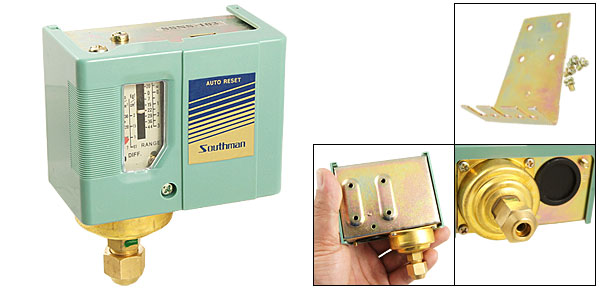 Product Name Pressure Switch Model NO. SNS-103 Adjustable Range 50cmHg to 3kgf/cm2 / 10-40PSI Differential 0.5-2kgf/cm2 / 7-28PSI Flare Hex Nut Size 1.5cm/ 0.59" Thread Diameter 1.08cm/ 0.4" Overall Size 8 x 4.6 x 10cm/ 3.1" x 1.8" x 3.9" (L*W*H) Color Green, Gold Tone Material Metal Net Weight 373g Package 1 x Pressure Switch 1 x Bracket Several Screw kit - Reviews