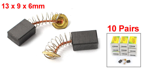 Product Name Motor Carbon Brush Material Carbon , Metal Color Black, Gold Tone Carbon Brush Size (Approx.) 13 x 9 x 6mm/0.51" x 0.35" x 0.24" (L*W*T) Total Length(Approx) 35mm/ 1.4" (When Spring Stretching) Weight 81g Package Content 10 Pairs x Motor Carbon Brush - Reviews