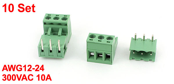 10 Pairs AC 300V 10A 5.08mm Spacing 3 Pin Screw Pluggable Terminal Block Green