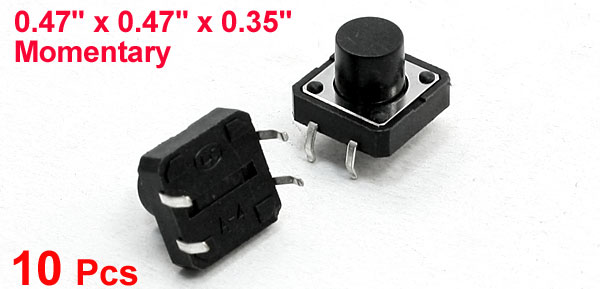 Product Name Tact Switch Action Type Momentary Total Size(Pin No Include) 12 x 12 x 9mm/0.47" x 0.47" x 0.35"(L*W*T) Button Size 6.5 x 6mm/0.26" x 0.24"(D*H) Material Plastic, Metal Color Black, Silver Tone Net Weight 9g Package Content 10 x Tact Switch - Reviews