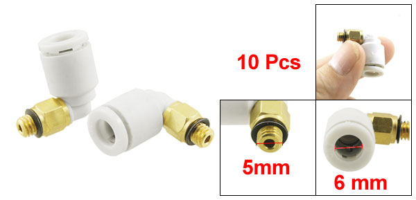 Item Name Push in to Connect Fitting Design Elbow Fit Tube Outside Diameter 6mm/15/64" Thread Diameter M5 (5mm/1/5") Overall Size 19 x 18 x 9mm/0.7" x 0.7" x 0.3" (L*W*H) Material Brass, Plastic Color Gold Tone, Gray Weight 27g Package Content 10 x Push in to Connect Fitting - Reviews