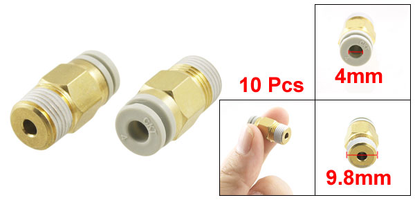 Item Name Push in to Connect Fitting Design Straight Male Connector Fit Tube Outside Diameter 4mm/5/32" Thread Diameter 1/8" PT(9.8mm) Overall Size 21 x 10mm/ 0.8" x 0.4" (L*Hex Size) Material Brass, Plastic Color Gold Tone, Gray Weight 70g Package Content 10 x Push in to Connect Fitting - Reviews