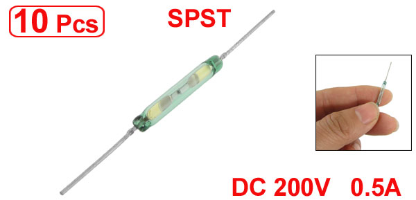 Product Name Reed Switch Contact Type SPST (Form A) Max. Contact Rating 10W Max. Switching Voltage DC 200V Max. Switching Current 0.5A Max. Carry Current 1.5A Max. Initial Contact Resistance 150mΩ Min. Insulation Resistance 10Ω Operate time 0.5ms Bounce time 0.4ms Release time 0.2ms Max. Operating Frequency 500Hz Pull in Value 10-15AT Glass Tube Size (Approx.) 3.5 x 18.5mm/ 0.137" x 0.728"(D*L) Lead Terminal Size(Approx.) 0.5 x 16.5mm/ 0.02" x 0.65"(D*L)(Each Side) Total Length (Approx.) 49mm/ 1.93" Color Silver Tone, Green Weight 3g Package Content 10 x Reed Switch - Reviews