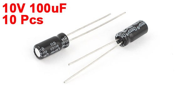 Product Name Electrolytic Capacitor Type Radial Leads Temperature Range -40~+105C Voltage 10V Capacitance 100uF Body Size 5 x 11mm/0.2" x 0.43"(D*H) Lead Space 2mm/0.08" Lead Length 21mm/0.8" , 27mm/1" External Material Aluminum Total Net Weight 5g Main Color Black Package Content 10 x Electrolytic Capacitors - Reviews