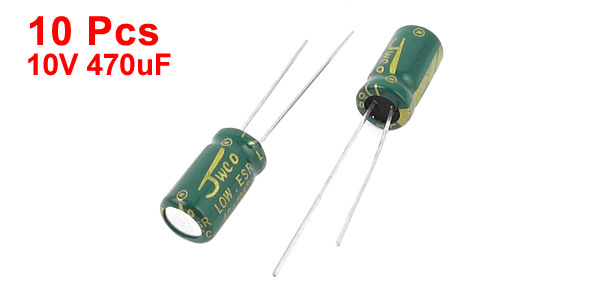 Product Name Electrolytic Capacitor Type Radial Lead Temperature -40 to +105C Voltage Rated 10V Capacitance 470uF Tolerance +/-20% Body Size 6 x 12mm / 0.24"x 0.5" (D*L) Lead Dia 0.6mm/0.02" Dielectric Material Aluminum Weight 7g Color Green Package Content 10 Pcs x Electrolytic Capacitor - Reviews
