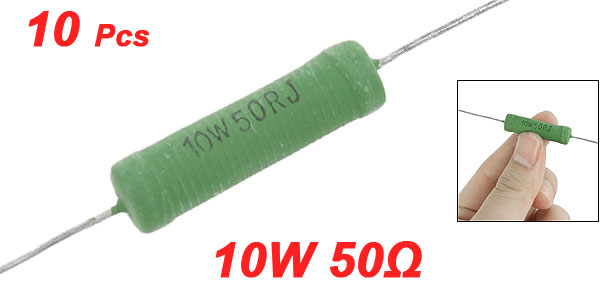 Product Name Wire Wound Resistor Type Fixed Type Rated Power 10W Resistance 50 Ω Resistance Tolerance ±5% (J) Material Metal, Ceramic Pin Diameter 0.7mm/ 0.028" Pin Length 29mm/ 1.1" (Each End) Body Size 7 x 30mm/ 0.28" x 1.2" (D*L) Total Length 90mm/ 3.5" Color Green Weight 39g Package Content 10 x Wire Wound Resistors - Reviews