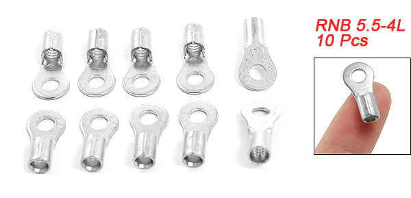Product Name Non-Insulated Ring Terminal Ring Terminals Construction Non-Insulated Type RNB 5.5-4L Design Ring Tongue Type Fit Cable Size 4-6mm2 (A.W.G 12 - 10) Max. Current 19A Ring Size 3.7 x 9mm / 0.145" x 0.354" (Inside Dia*Outside Dia) Tube Hole Size 3 x 5.2mm / 0.118" x 0.204"(Inside Dia*Outside Dia) Total Length 20.5mm / 0.807" Material Metal Color Silver Tone Weight 15g Package Content 10 Pcs x Non-Insulated Ring Terminal - Reviews