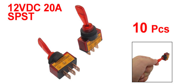 SPST Pin Quantity 3 Position 2 Position(ON/OFF) Max. Current 20A Max. Voltage 12VDC Button Lamp Color Red Main Body Size(Pin not Included) 2.6 x 1.2 x 1.4cm / 1.02" x 0.47" x 0.57" (L*W*T) Total Size(Approx) 2.6 x 1.2 x 6.2cm / 1.02" x 0.47" x 2.4" (L*W*H) Mounting Thread Diameter 12mm / 0.47" Main Color Red Material Plastic, Metal Weight 91g Package Content 10 Pcs x Toggle Switch - Reviews