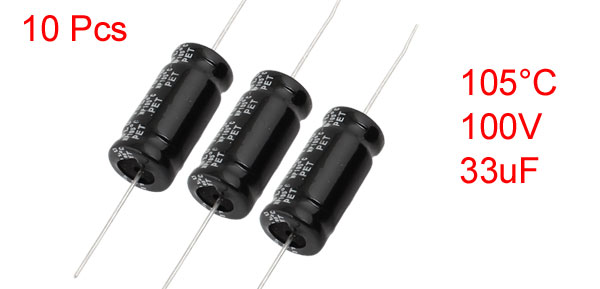 Product Name Electrolytic Capacitor Type Radial Lead Features Standard General Purpose Maximum Temperature 105°C Withstand Voltage 100V Capacitance 33uF Body Size 13 x 25mm / 0.5'' x 0.98'' (D*L) Lead Length 28mm/ 1.1'' Dielectric Material Aluminum Weight 48g Color Black Package Content 10 Pcs x Electrolytic Capacitors - Reviews