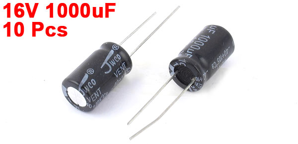 Product Name Electrolytic Capacitor Type Radial Lead Temperature -40 to +105C Voltage Rated 16V Capacitance 1000uF Tolerance +/-20% Body Size 10 x 17mm / 0.4"x 0.7" (D*L) Lead Dia 0.6mm/0.02" Dielectric Material Aluminum Weight 18g Color Black Package Content 10 Pcs x Electrolytic Capacitor - Reviews