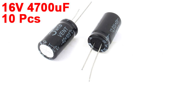 Details10 Pcs 16V 4700uF 105C Radial Lead Electrolytic Capacitor 13mm x 25mm  Product Name Electrolytic Capacitor Type Radial Lead Temperature -40 to +105C Voltage Rated 16V Capacitance 4700uF Tolerance +/-20% Body Size 13 x 25mm / 0.5"x 1" (D*L) Lead Dia 0.6mm/0.02" Dielectric Material Aluminum Weight 49g Color Black Package Content 10 Pcs x Electrolytic Capacitor
