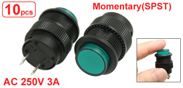 Item Name Push Button Switch Model R16-503/B Contact Type Normally Open, SPST Action Type Momentary Working Voltage AC 250V Working Current 3A Mounting Thread Diameter 16mm / 0.63" Button Cap Diameter 13mm / 0.5" Terminals 2 Overall Size 18 x 30mm / 0.7" x 1.2" (Dia.*H) Material Plastic, Electronic Parts Weight 43g Package Content 10 Pcs x Round Push Button Switch - Reviews