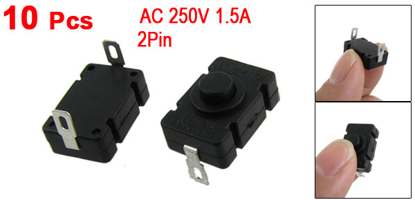 Product Name Torch Push Button Switch Contact Type Latching Contact Voltage/ Current AC 250V 1.5A Pin Number 2(Double Row) Terminal Driection Vertical Overall Size 18 x 12 x 15mm/ 0.7" x 0.47" x 0.59" (L*W*H) Button Diameter 5mm/ 0.2" Material Plastic, Metal, Electric Parts Color Black, Silver Tone Net Weight 21g Package Content 10 x Torch Push Button Switch - Reviews