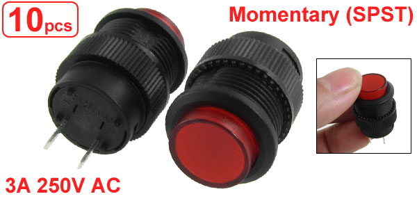 Item Name Push Button Switch Type Momentary (SPST) Rating Voltage 3A 250V AC Terminals 2 Pin Cap Dia. 13mm/0.51'' 2 Pin Space Pitch 6.3mm/0.25'' Thread Dia. 15mm/0.59'' Total Size 29 x 18mm/1.14'' x 0.71'' (L*Max.D) Material Plastic, Metal Weight 44g Package Content 10 x Push Button Switch - Reviews