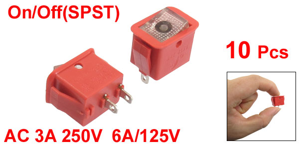 Item Name Rocker Switch Type On/Off(SPST) Voltage & Current AC 3A 250V, 6A/125V Size 18 x 12 x 21mm / 0.7" x 0.47" x (L*W*H) Mount Hole Diameter 17 x 11mm / 0.67" x 0.43"(L*W) Color Red Material Plastic & Metal Total Weight 23g Package Content 10 x Rocker Switch - Reviews