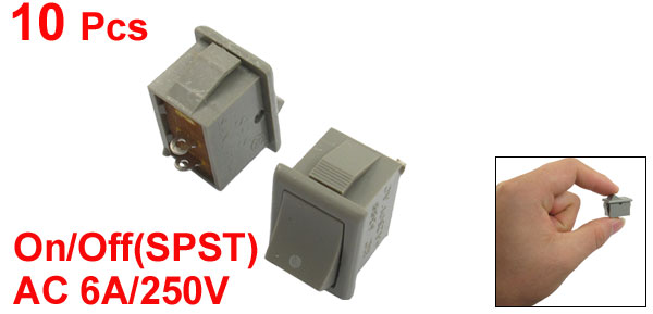 Item Name Rocker Switch Type On/Off(SPST) Voltage & Current AC 6A/250V Size 21 x 15 x 20mm / 0.83" x 0.6" x 0.78"(L*W*H) Mount Hole Size 18 x 12mm / 0.7" x 0.47"(L*W) Color Gray Material Plastic & Metal Total Weight 22g Package Content 10 x Rocker Switch - Reviews