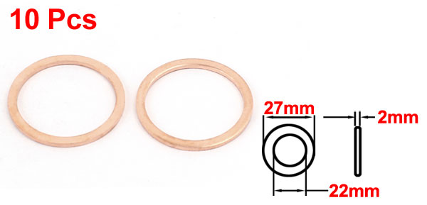 Details10 Pcs 22mmx27mmx2mm Flat Copper Crush Washer Ring Gasket Fitting  Product Name Copper Washer Inner Diameter 22mm/0.87" Outer Diameter 27mm/1" Thickness 2mm/0.08" Material Copper Color Copper Tone Weight 29g Package Content 10Pcs x Copper Washer