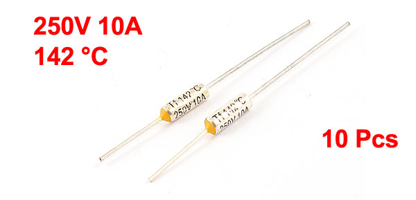 Product Name Thermal Fuse Rating 250V 10A Cutoff Temperature 142 °C Fuse Size 4 x 13 mm / 0.16" x 0.51" (D*L) Total Length 6.6cm / 2.6" Main Material Aluminum Fuse, Metal Leads Color Silver Tone Weight 11g Package 10 Pcs x Thermal Fuse - Reviews