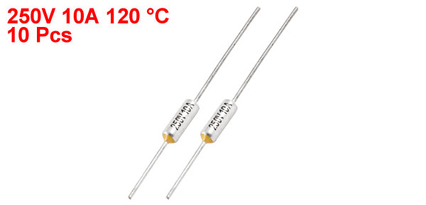 Product Name Thermal Fuse Rating 250V 10A Cutoff Temperature 120 °C Fuse Size 4 x 13 mm / 0.16" x 0.51" (D*L) Total Length 6.6cm / 2.6" Main Material Aluminum Fuse, Metal Leads Color Silver Tone Weight 11g Package 10 Pcs x Thermal Fuse - Reviews