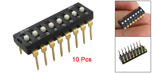 Product Name DIP Switch Type IC Type Position 8 Row 2 Pitch 2.54mm/0.1'' Non-Switching Rating 100mA DC 50V Switching Rating 25mA DC 24V Contact Resistance 50mΩ 24VDC/100mA (at initial) 100mΩ typical, 24VDC/100mA (after life test) Overall Size(Approx.) 22 x 8 x 9mm/0.86'' x 0.31'' x 0.35'' (L*W*H) Material Plastic, Electric Parts Color Black, Gold Tone Weight 10g Package Content 10 Pcs x IC Type DIP Switches - Reviews