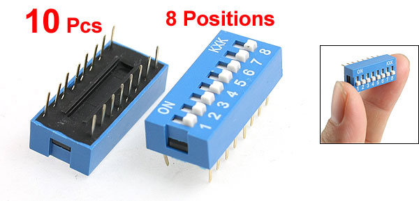 Product Name DIP Switch Type DIP Features 8 Positions( 2 Row 16 Pin) Pitch 2.54mm/0.1'' Non-Switching Rating 100mA DC 50V Switching Rating 25mA DC 24V Contact resistance 50mΩ 24VDC/100mA (at initial) 100mΩ typical, 24VDC/100mA (after life test) Total Size 2.2 x 1 x 1cm / 0.87" x 0.4" x 0.4"(L * W * H) Material Plastic, Electric Parts Color Blue, Gold Tone Net Weight 16g Package Content 10 x DIP Switch - Reviews