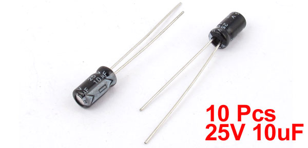 Product Name Electrolytic Capacitor Type Radial Lead Temperature -40 to +105C Voltage Rated 25V Capacitance 10uF Tolerance +/-20% Body Size 4 x 8mm / 0.16"x 0.31" (D*L) Lead Dia 0.6mm/0.02" Dielectric Material Aluminum Weight 3g Color Black Package Content 10 Pcs x Electrolytic Capacitor - Reviews