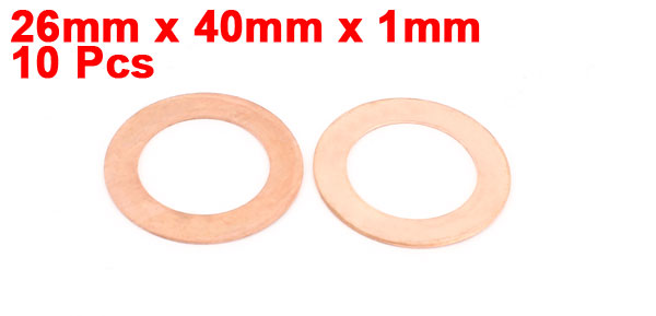 Details10 Pcs 26mm Inner Dia 1mm Thickness Copper Flat Washer Ring Gasket Seal Fitting  Product Name Copper Washer Total Size 26 x 40 x 1mm/1" x 1.6" x 0.04"(Inner Dia*OD*T) Material Copper Color Copper Tone Net Weight 58g Package Content 10 x Copper Washers
