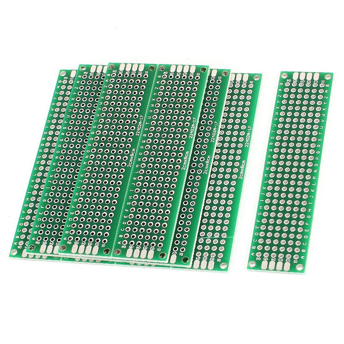 Product Name Universal PCB Board Hole Dia(Approx) 1mm / 0.04" Hole Pitch(Approx) 2.54mm / 0.1" Size(Approx) 2 x 8cm /0.8" x 3.1"(W*L) Thickness(Approx) 1.6mm / 0.063“ Install Hole Dia 2mm/0.08" Install Hole Distance 7.1 x 1.6cm/2.8" x 0.63"(L*W) Material FR-4, Tin Color Green, Silver Tone Net Weight 46g Package Content 10 x Universal PCB Board - Reviews