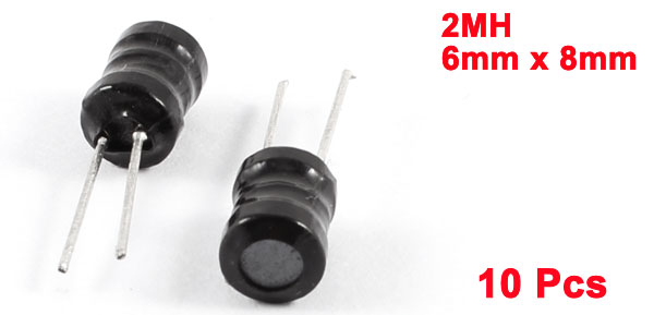Product Name Inductor Material UL-polyolefin, Metal Inductance 2MH Body Size 6 x 8mm / 0.236" x 0.31"(D*H) Lead Diameter 0.5mm / 0.196" Color Black, Silver Tone Weight 11g Package Content 10 x Inductors - Reviews