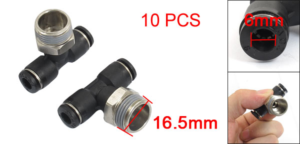 Product Name Quick Fittings Model JPB6-03 Design Tee Shaped Thread Size 3/8" PT Thread Diameter 16.5mm Tube Diameter 6mm Material Plastic Dimension (Approx) 40 x 32 x 17mm/ 1.6" x 1.3" x 0.7" (L*W*H) Color Black Weight 196g Package Content 10 x Quick Fittings - Reviews