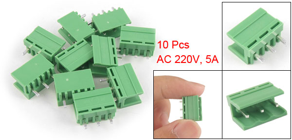 Product Name Pluggable Terminal Block Material Plastic Rated Value AC 220V, 5A Pin Number 3 Pitch 5.08mm/0.2'' Total Size 15 x 8 x 14mm/0.6'' x 0.3'' x 0.6'' (L*W*H) Color Green Weight 10g Package Content 10 x 3P Pluggable Terminal Block - Reviews