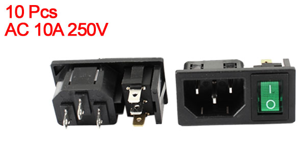 10 Pcs 3 Pin SPST Green Lamp Rocker Switch IEC320 C14 Power Socket AC 10A 250V